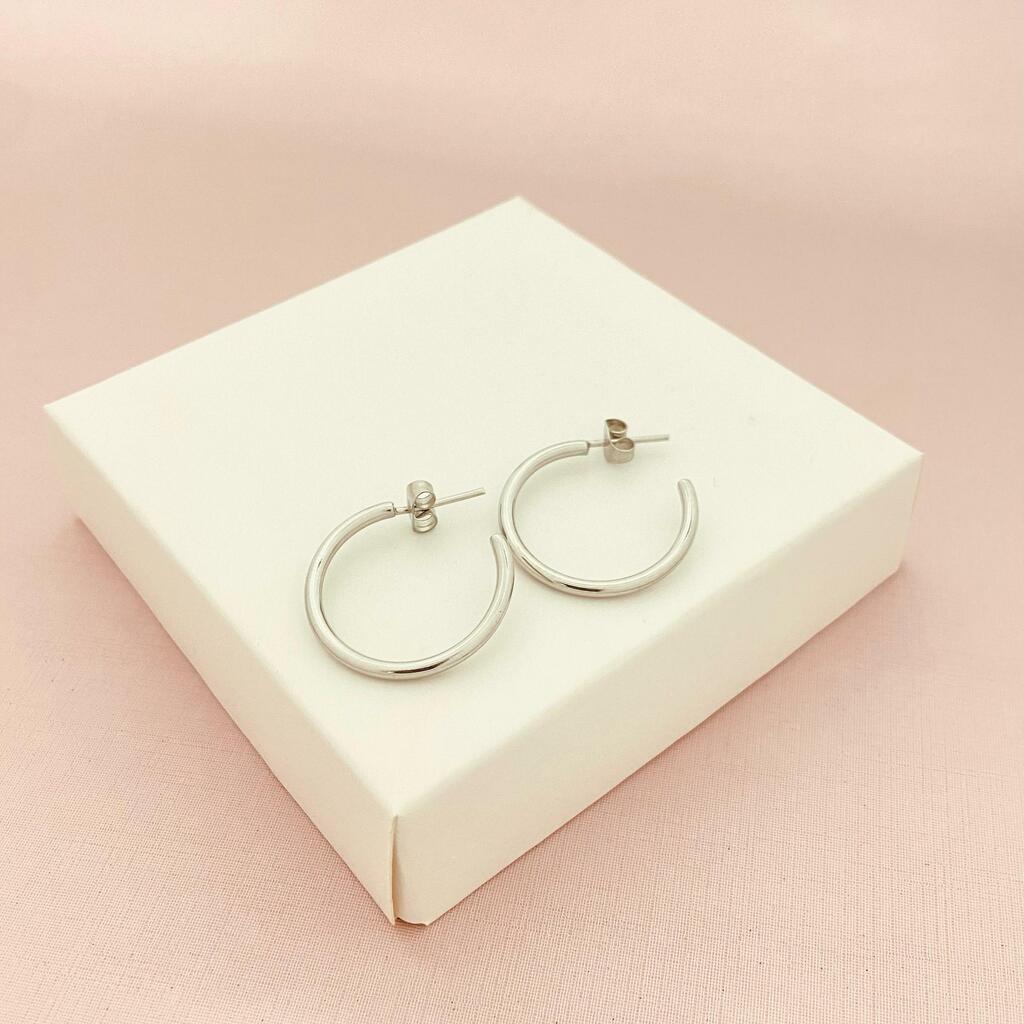 Realce seu estilo com o Brinco Argola 1,2cm em aço banhado a ródio branco, uma peça que une resistência e elegância em um design clássico e moderno.